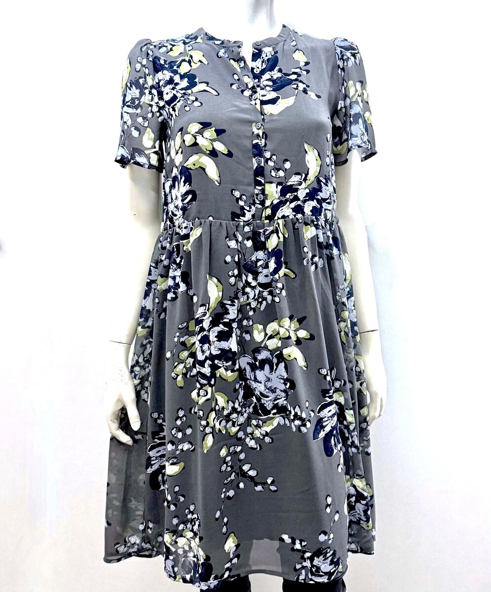 Rosemunde kangasmekko XS. Materiaali sifonkimainen polyester-kangas/viskoosi-vuori, tummanharmaalla pohjalla upea kukkakuviointi, edustassa nappilista, vy lähtevät laskokset. Ihana mekko moneen menoon.