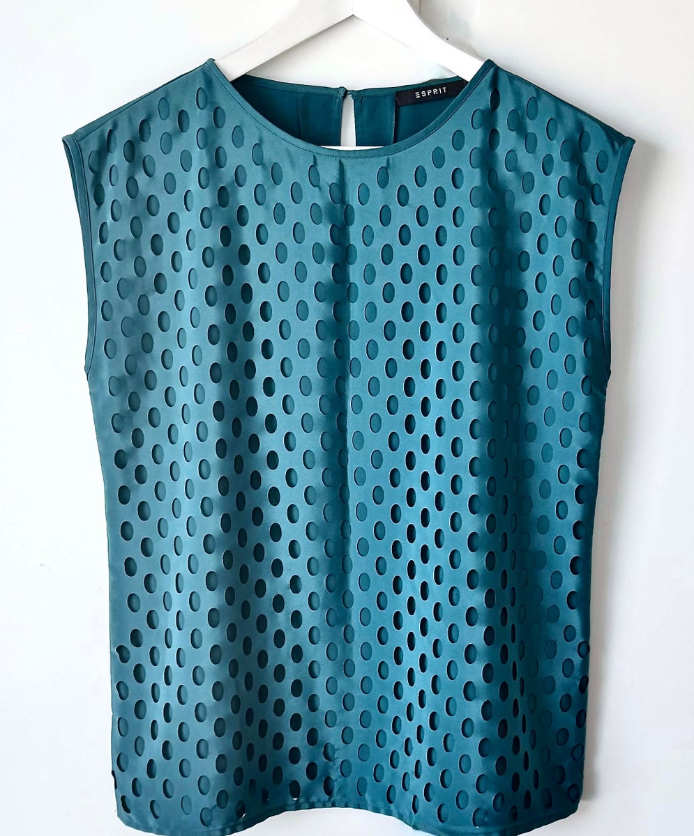 Esprit kangaspusero 36. Materiaali polyester -kangas, etuosassa reikäkuvioitu päällikangas, turkoosinsävyinen upea pusero.